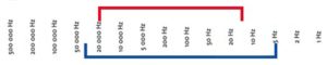 Afbeelding: bereik gehoor mens (boven) en hond (onder)